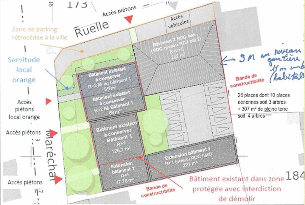 Voici le document que l’association s’est procurée, présentant le projet de réhabilitation du bâtiment Orange et la construction de 28 logements.